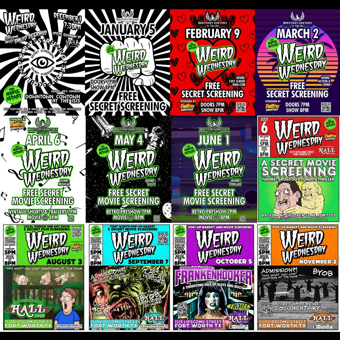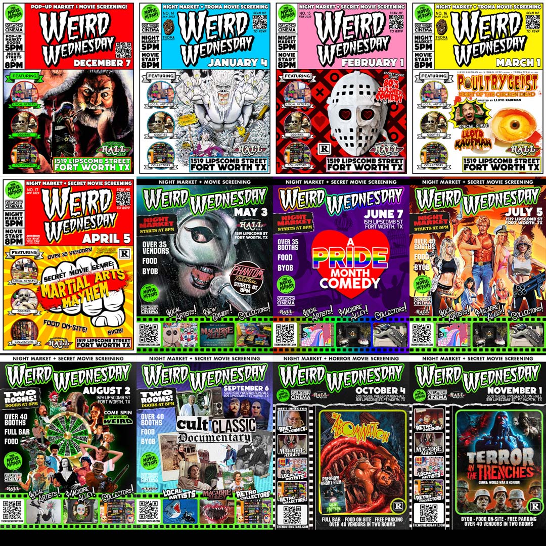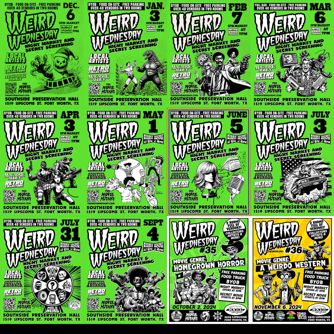 On the first Wednesday of every month, The Movie Mutant takes over Southside Preservation Hall in Fort Worth for a night of movies, art, collectors, and more. There’s free parking, food on-site, and it’s BYOB.